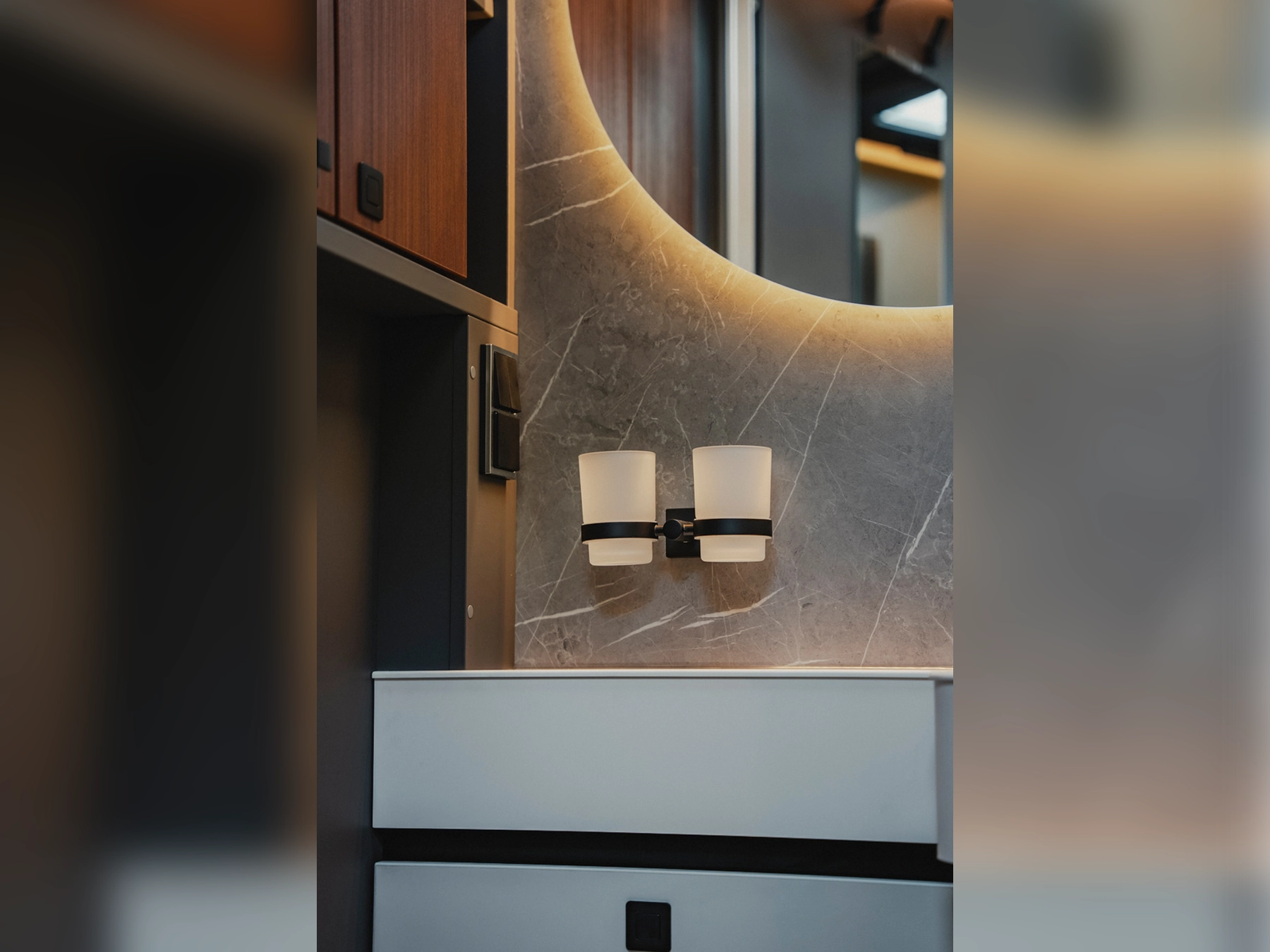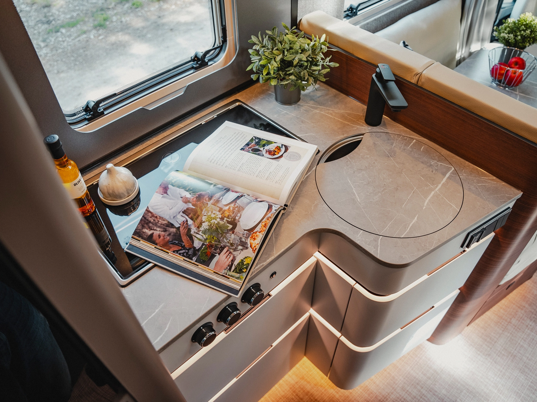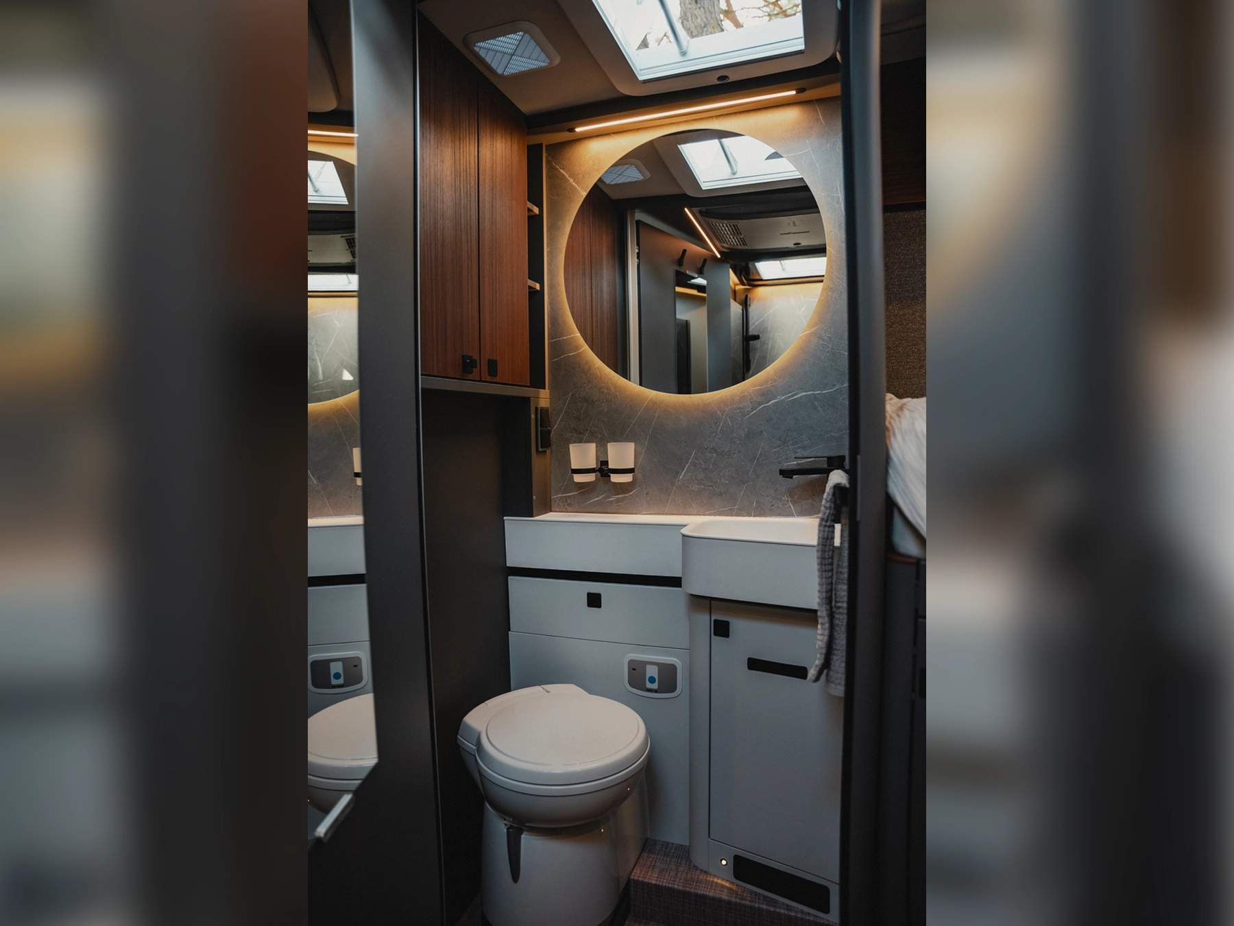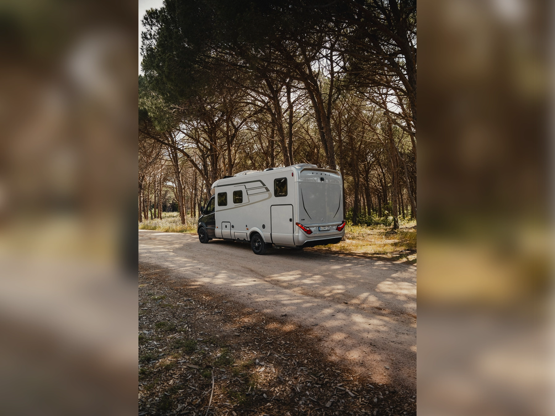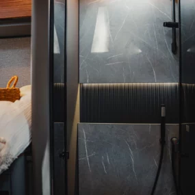 The 2026 HYMER B‑MC T 680 combines elegance and functionality in a thoughtfully engineered package. It rides on the award-winning Sprinter-based Super Light Chassis (SLC) designed by HYMER with Mercedes‑Benz. The layout features fixed twin single rear beds above a generous garage for storage. The 2026 updates include a redesigned washroom with integrated storage and indirect lighting, electric central locking for the kitchen units, a compressor fridge, and flush-mounted utility flaps for a clean exterior look. Interior styling choices include “Rochefort Nuss” or lighter “Matara Teak” finishes, enhanced by a four-zone lighting system and smart connectivity via the HYMER Connect app for control over vehicle systems.